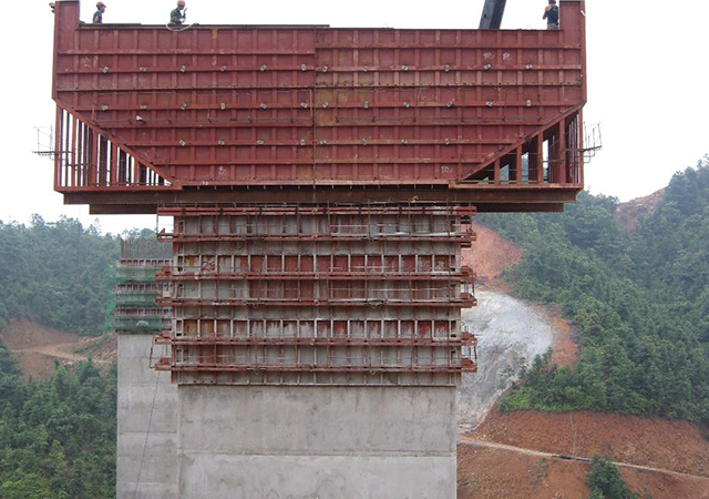 蓋梁模板采用托架法現(xiàn)澆,模板采用大塊組合鋼模,利用預留的孔洞安裝托架縱橫梁,在橫梁上拼裝好底模。然后先綁扎蓋梁鋼筋,經(jīng)監(jiān)理工程師檢查合格,再拼裝兩側(cè)的模板。